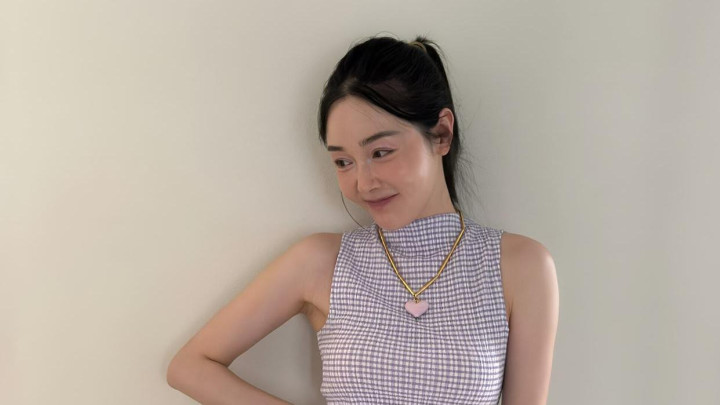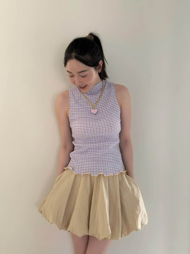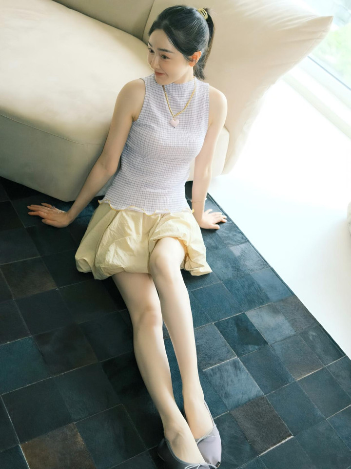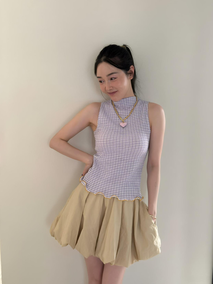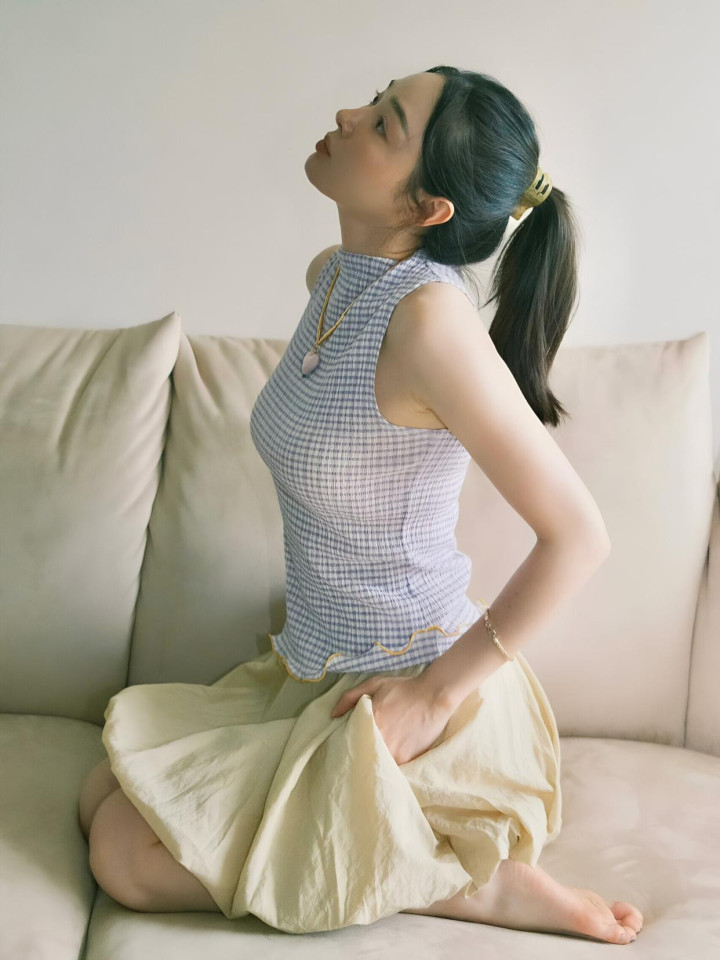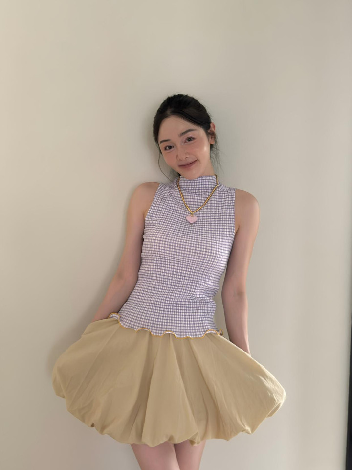 盛朗熙高颅顶马尾 + 格纹无袖,沙漏腰与蓬裙碰撞,甜飒拉满